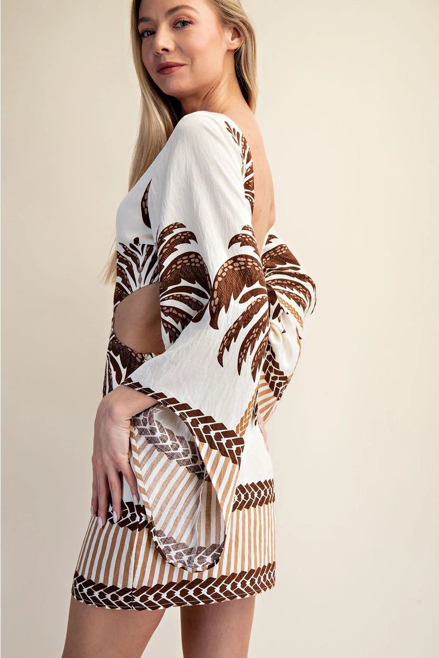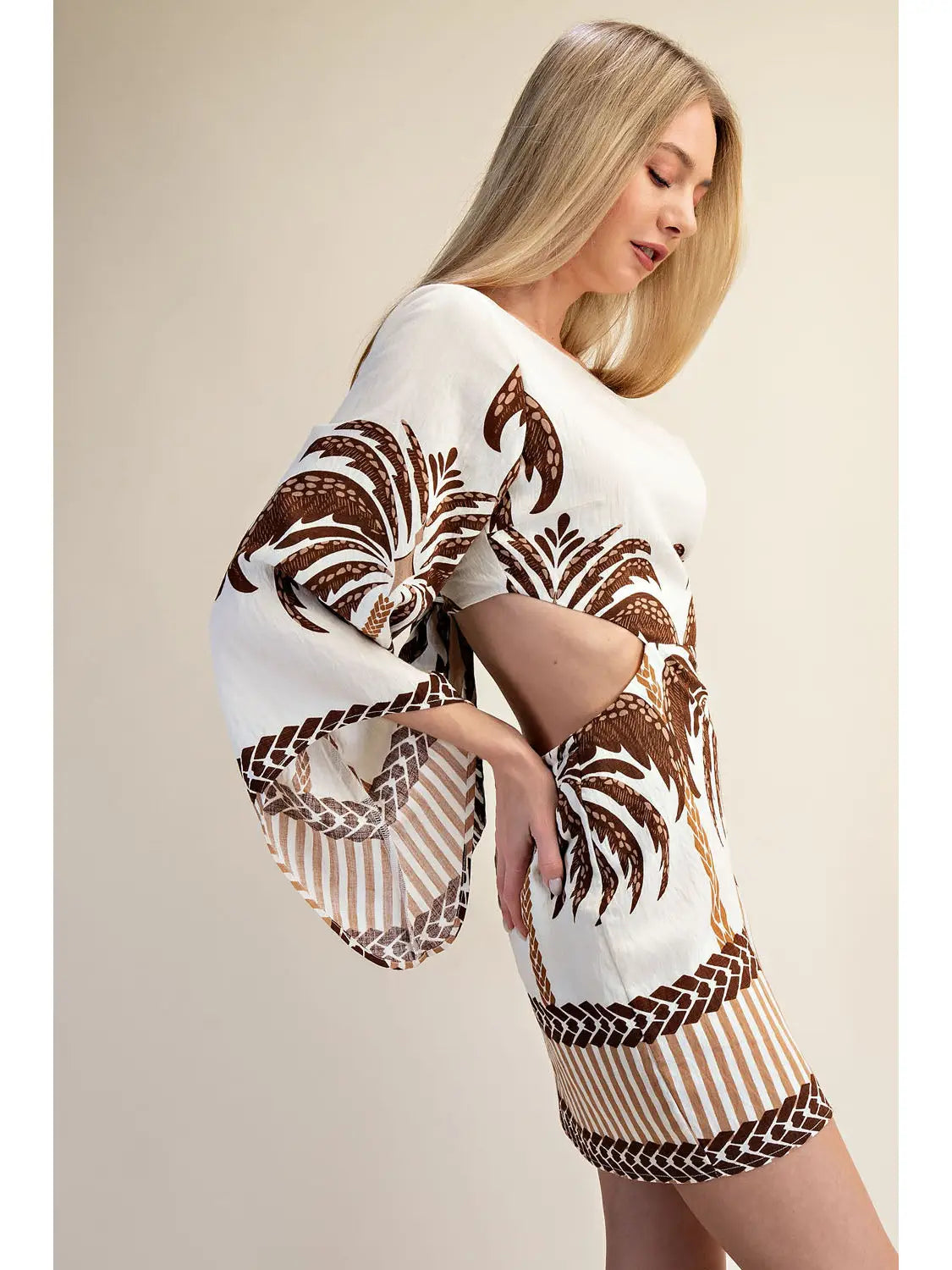 A refined mini dress featuring an elegant palm motif that brings a modern resort-inspired mood. Designed with a clean boat neckline and structured long straight sleeves, this piece offers a balanced silhouette with subtle side cut-out details at the waist for a flattering fit. The contrast cuff and hem detailing add visual interest, while the mini length keeps the look chic and contemporary. Perfect for daytime events, vacations, or elevated casual styling.