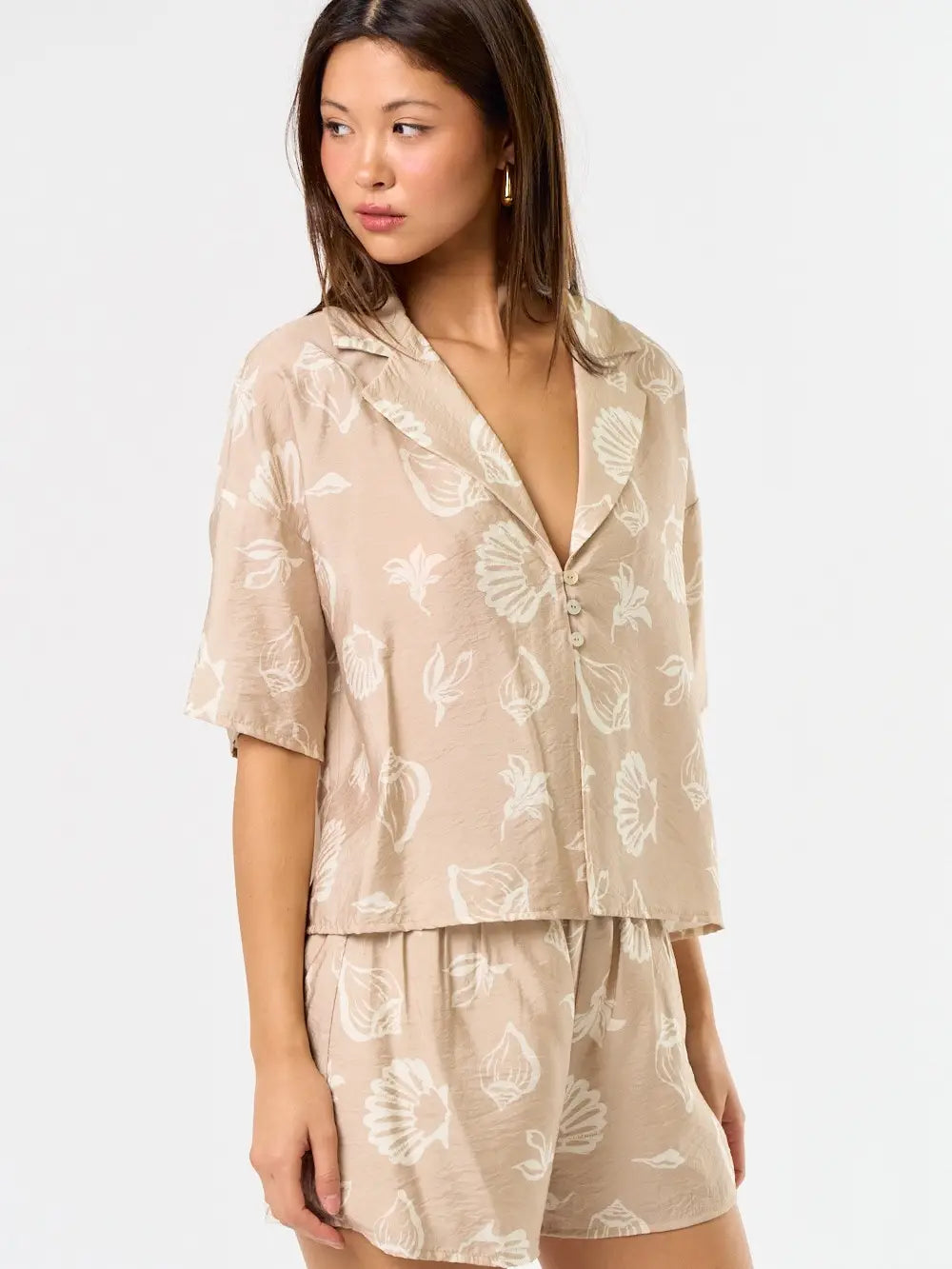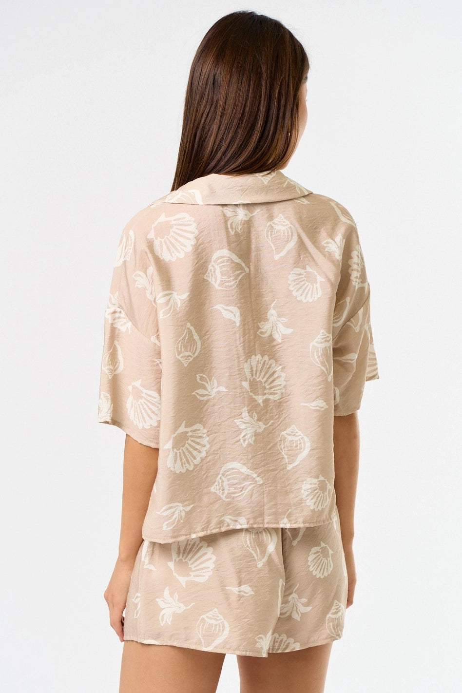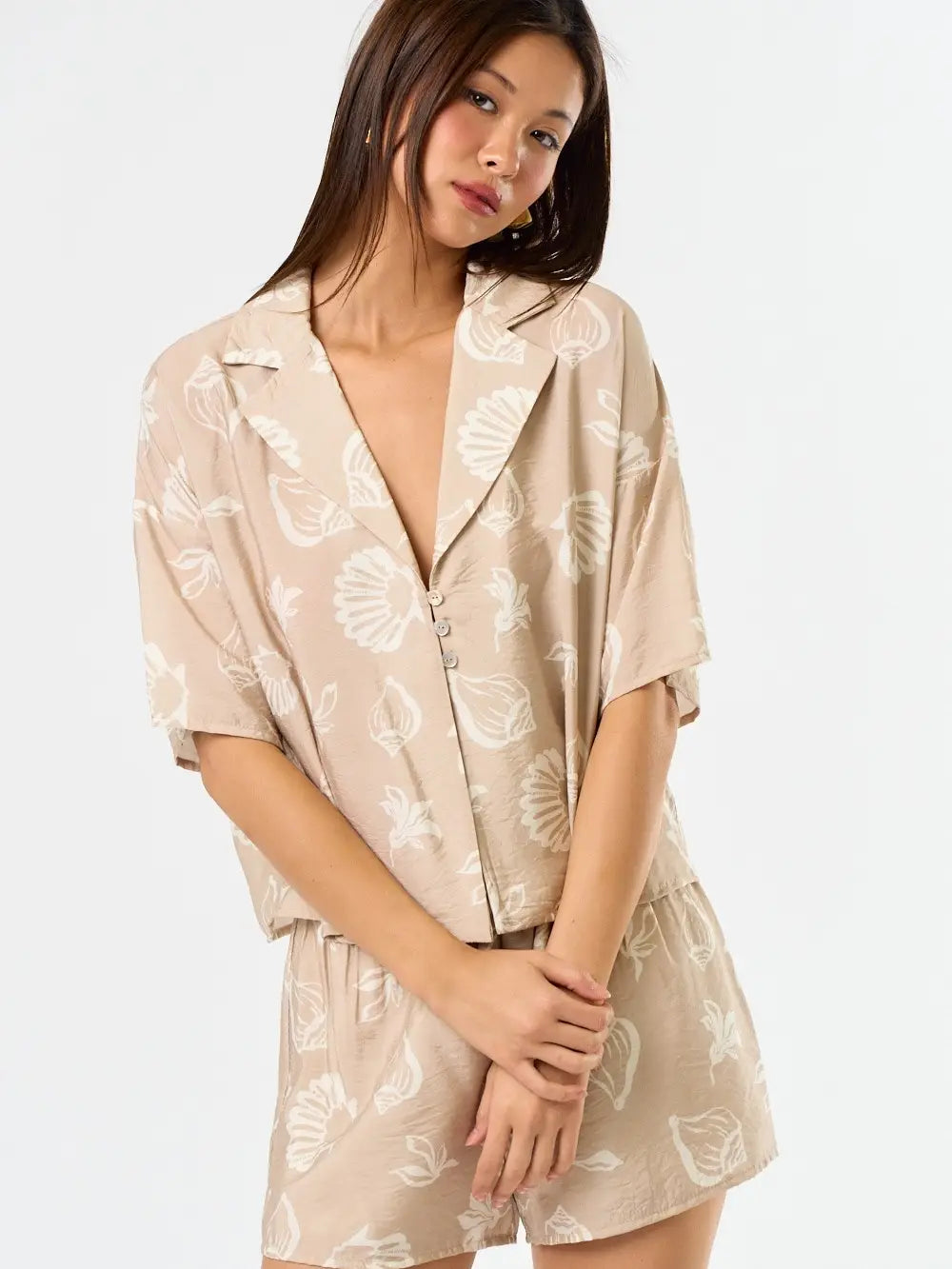 Embrace effortless coastal charm with this seashell print flowy shirt and matching shorts set. The relaxed button-down shirt pairs perfectly with lightweight, comfortable shorts, creating a breezy, coordinated look ideal for warm-weather days, beach trips, or casual outings. With its playful seashell print and versatile style, this set makes it easy to look chic while staying comfortable all day long.